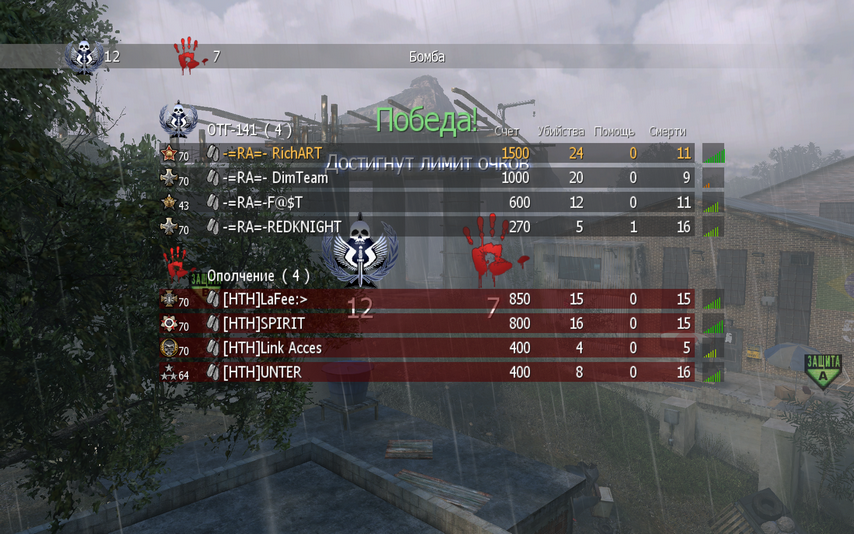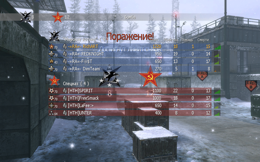 | К сожалению, противник после второй карты сильно разнервничался и при переговорах о том, как определять решающую третью карту, покинул игру всем составом. Мы считали, что выбирать карту должна была команда, набравшая большее количество выигрышных раундов по сумме сыгранных карт, они - хотели решить раундом на ножах. В принципе, мы бы согласились и на их предложение, но HTH не стали разговаривать и быстренько ... ушли, как будто только и ждали предлога. На своем сайте они опубликовали результаты матча как 2:1 в их пользу. Ну что же ... мир им. Мы им засчитываем техническое поражение. | ||||||||||||||||||||||||||