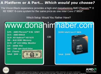 Журналисты ресурса DonanimHaber.com получили доступ к одному занимательному слайду, на котором компания AMD предлагает вместо покупки одного процессора Core i7-980X Extreme Edition, приобрести полноценный ПК на базе Phenom II X6 1090T Black Edition с 24-дюймовым широкоформатным ЖК-дисплеем.