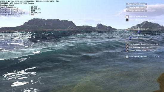 Однако, думается, NVIDIA не просто так отключила традиционный запрет запуска демонстраций на конкурентных решениях. Дело в том, что производительность на high-end-ускорителе ATI Radeon HD 5870 не производит глубокого впечатления. Главными технологическими особенностями демонстрации Island является создание реалистичных морских волн с использованием шейдерного языка DirectCompute и аппаратной тесселяции DirectX 11.