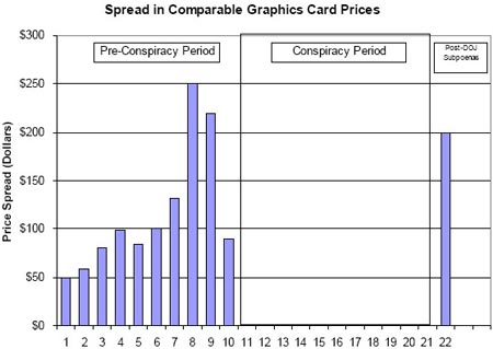 Другими словами, NVIDIA и ATI, возможно, согласовывали свои действия, создавая видимость конкуренции — на секретных встречах их представители оговаривали уровни цен, сроки выхода новых продуктов и другие шаги. Такая «псеводконкуренция» позволяла, выступая в роли единого монополиста, повышать уровень продаж и доходов.