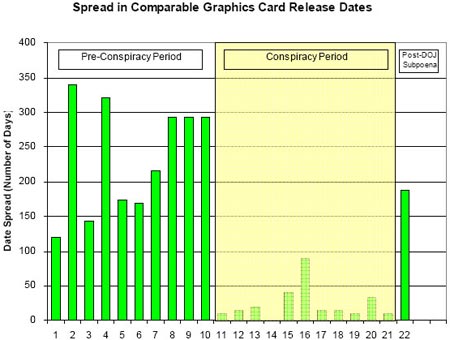 Иллюстрации наглядно показывают, как со временем менялось поведение NVIDIA и ATI. Верхний график демонстрирует различие в цене между сопоставимыми моделями графических карт, нижний — разницу между датами выпуска новых моделей. Первый участок на графиках соответствует периоду «до сговора» (Pre-conspiracy), второй – «во время сговора» (Conspiracy). Третий, очень короткий период, начинается в момент, когда компании получили вызов в суд (Post-DOJ Subpoena).
